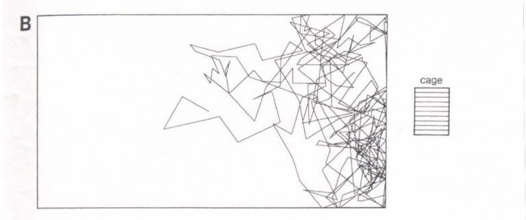 Dr. Rene Peoch experimentierte mit Küken, die auf einen kleinen Roboter geprägt wurden. Die Küken hielten den Roboter für ihre Mutter und folgten ihm auf Schritt und Tritt. Gesteuert wurde der Roboter von einem Zufallsgenerator und seine Wege zeichnete er mithilfe eines Stiftes auf den Untergrund auf. Das sah dann so aus: